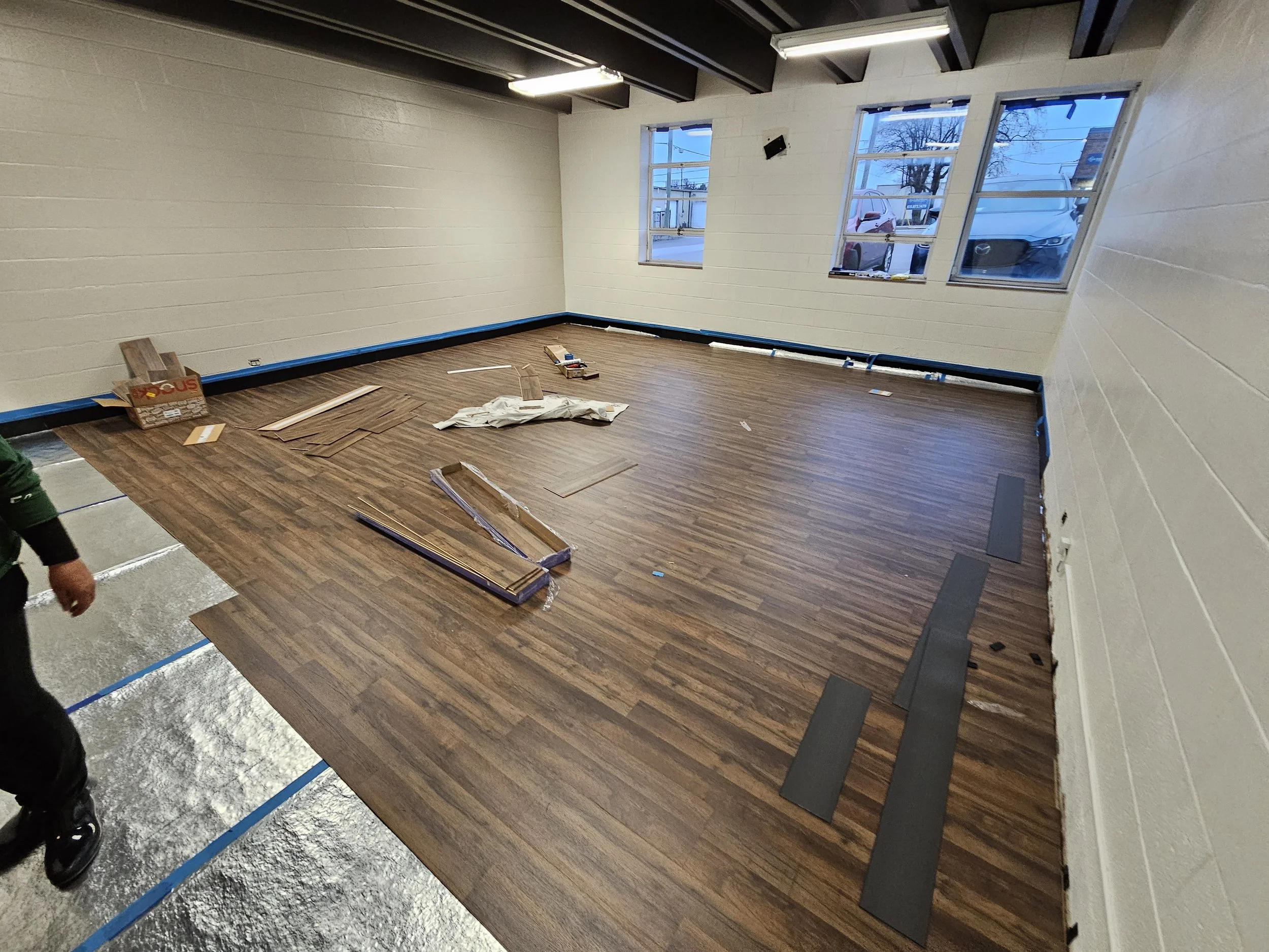 The biggest way were were Creative was to update the flooring. The carpet need to be replacing, and this way a way to elevate this space for teens.